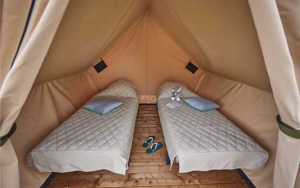 This 17 m² tent has two bedrooms, one with two beds and the other with a double bed. In the central area, you'll find a fridge, coffee maker and crockery. A terrace lets you make the most of your outdoor vacation!